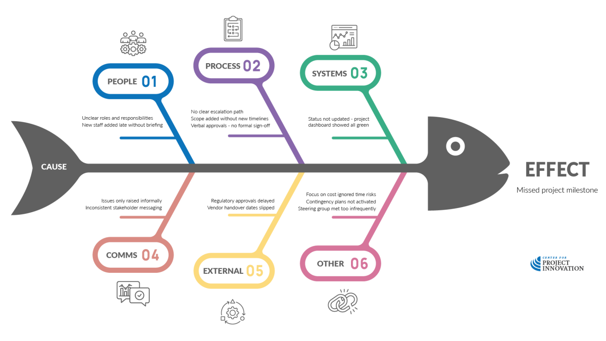 The goal isn’t to hunt for a final “ultimate cause,” because projects are rarely that simple. Instead, the goal is to identify the most significant causes that we can influence — and decide what can be done next time to avoid, reduce, or shift the impact.